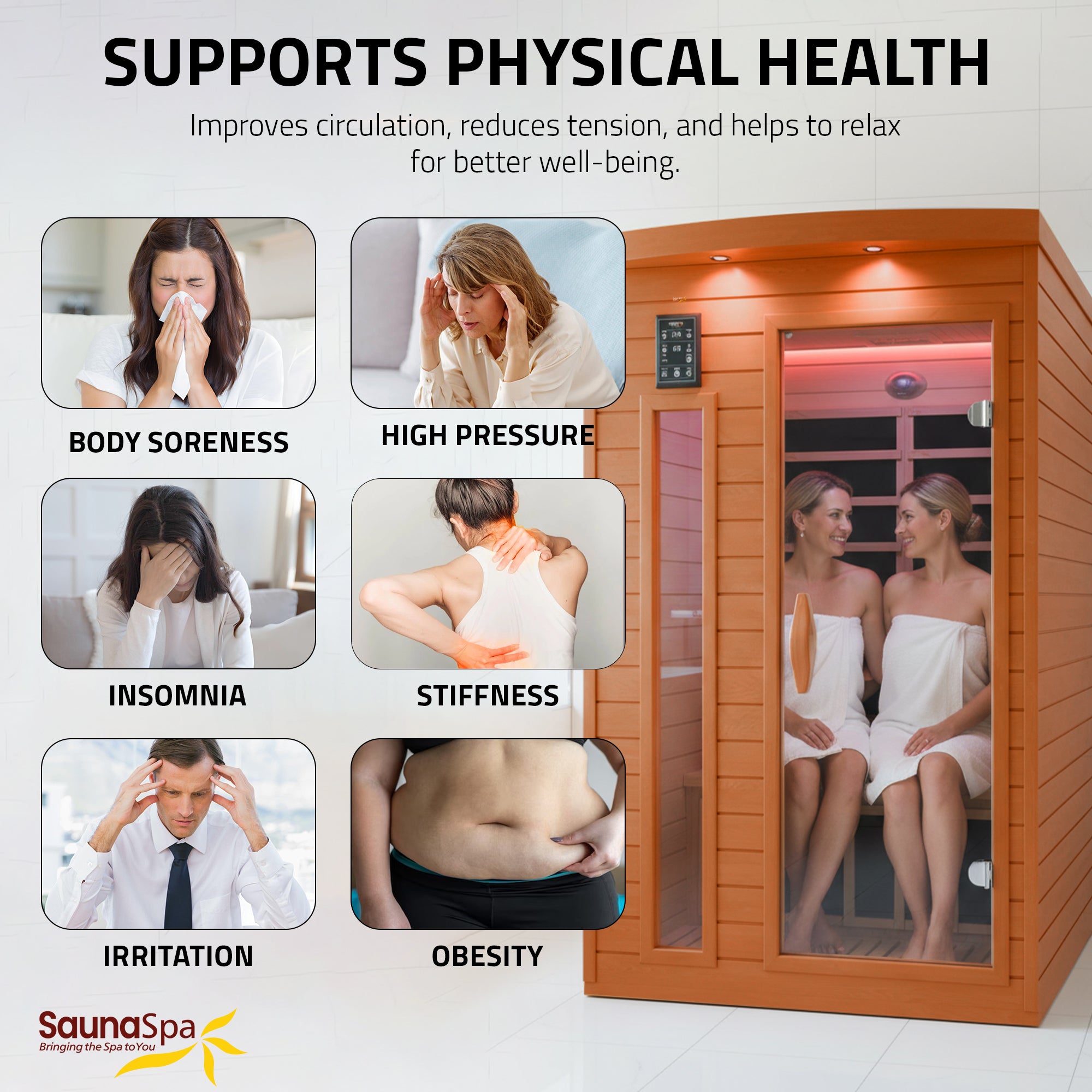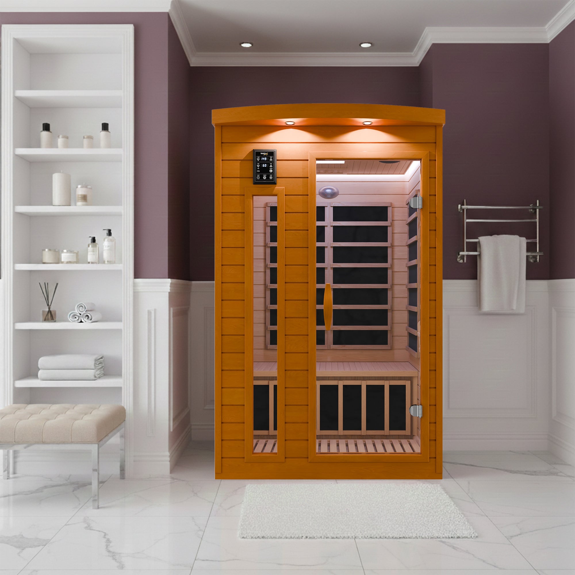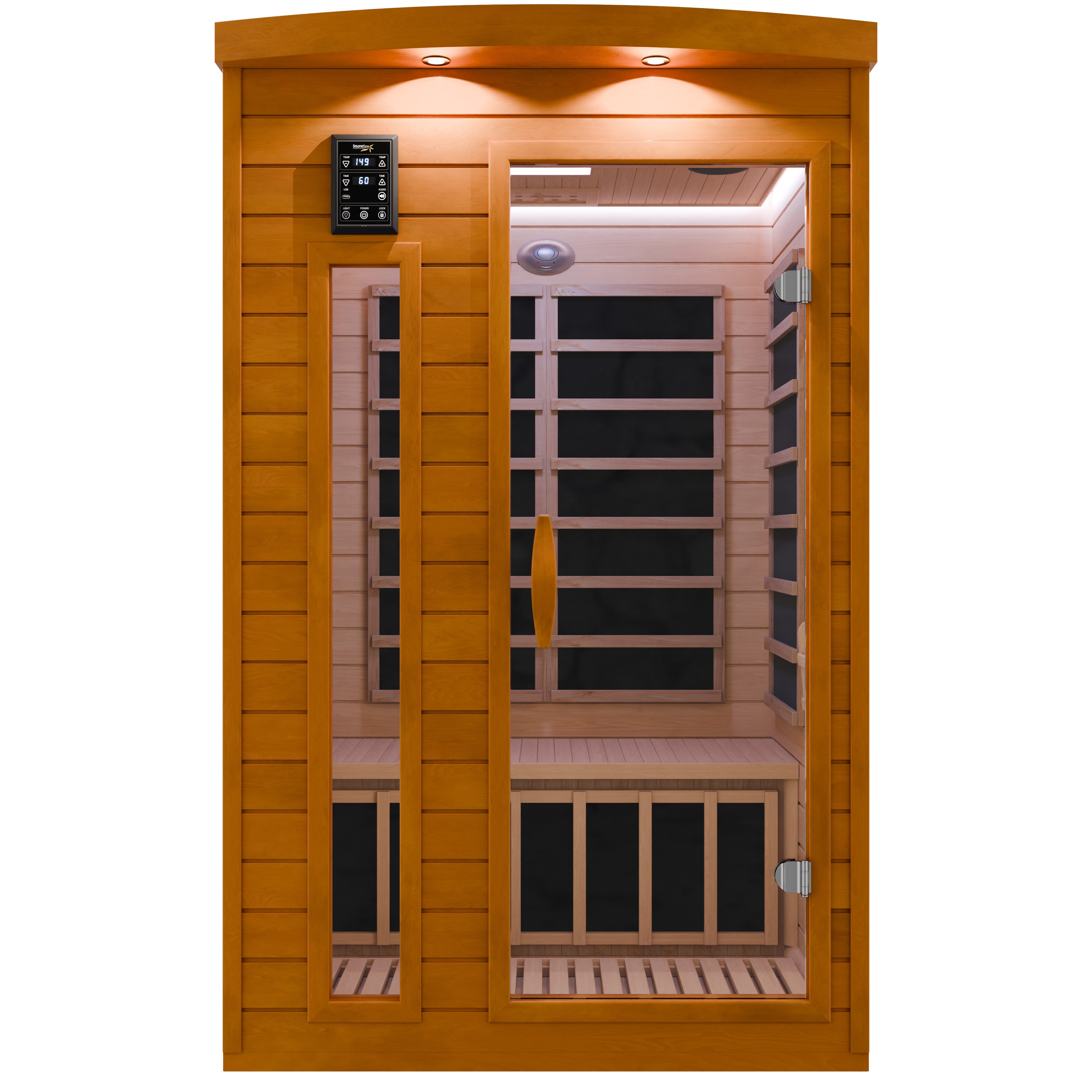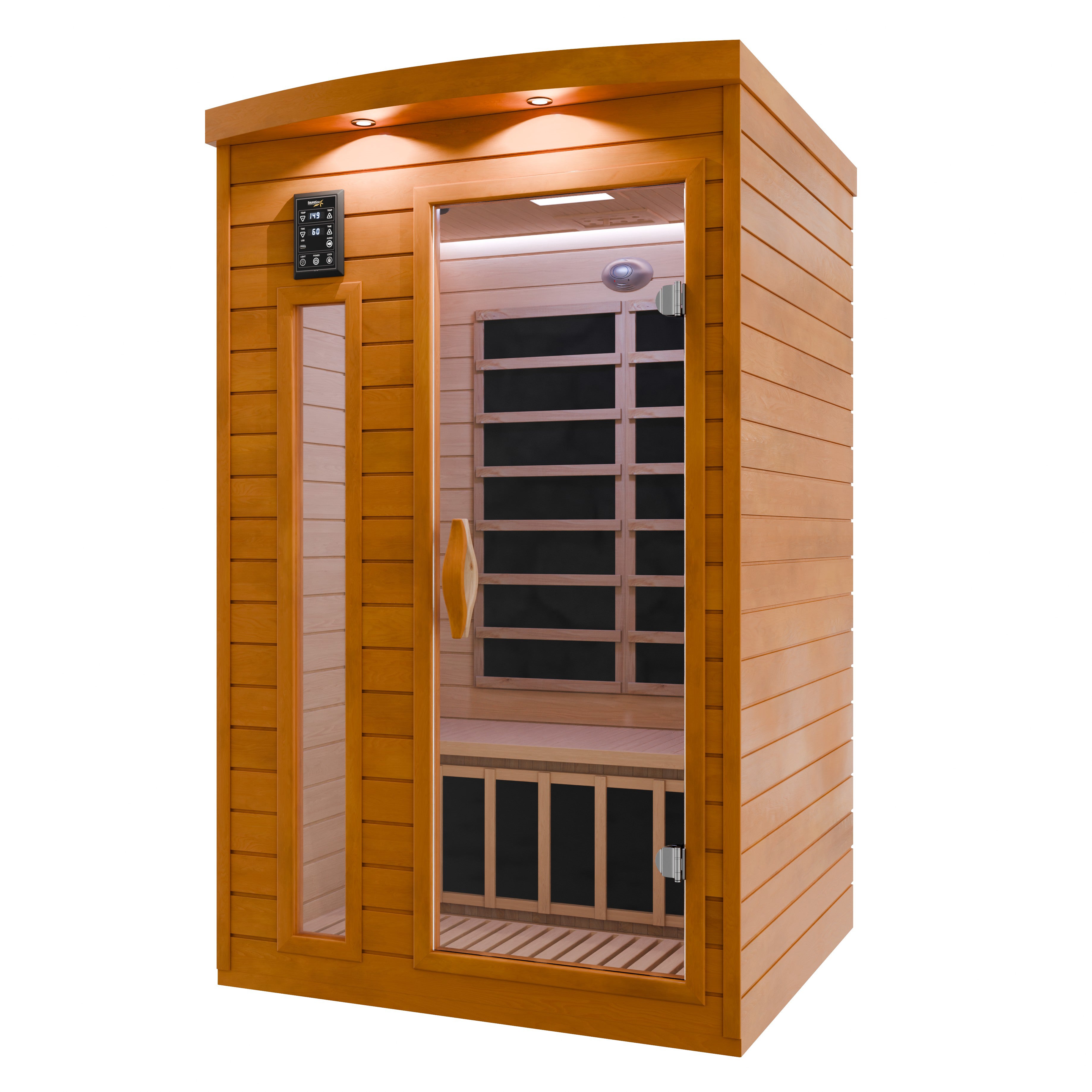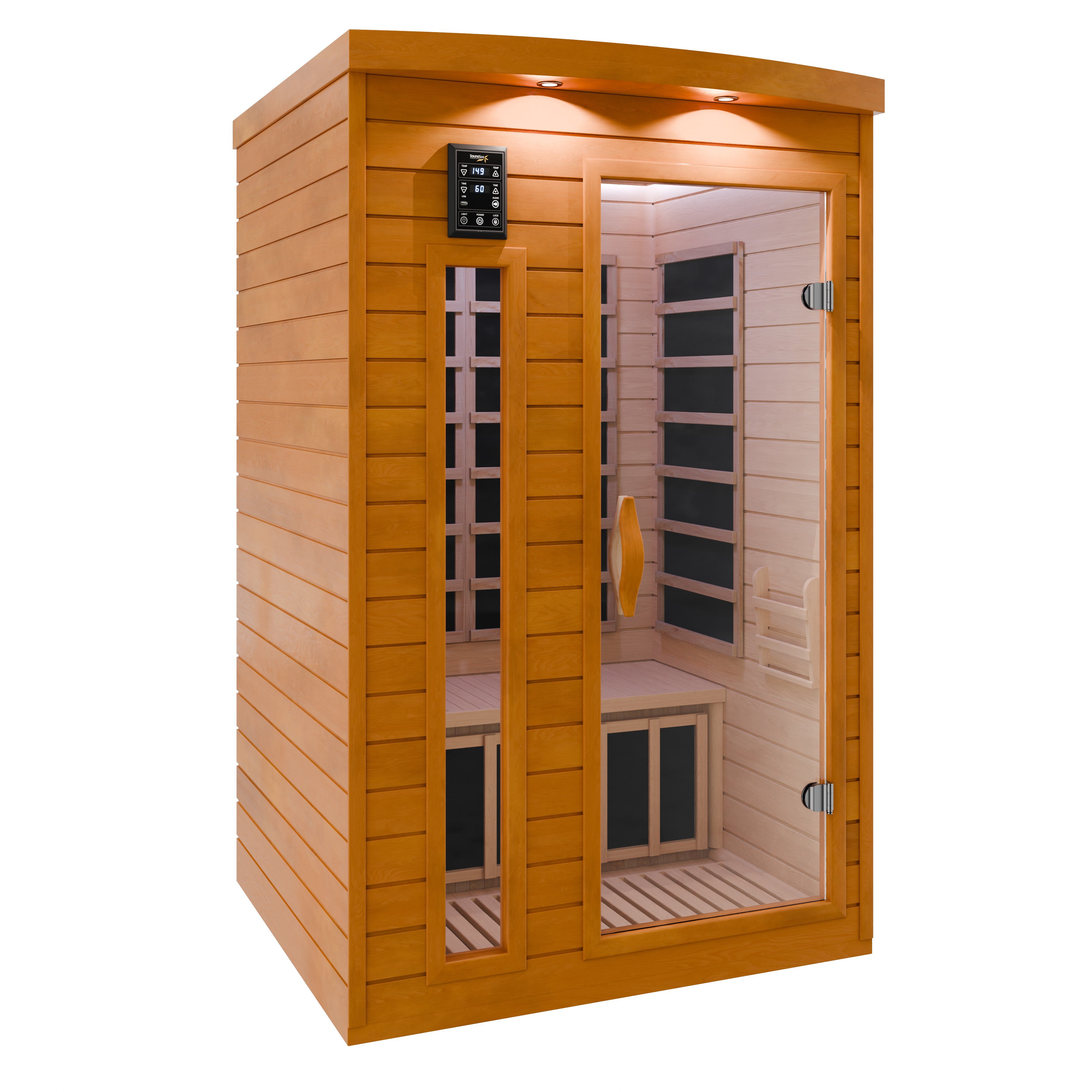 Create a calming daily ritual with this SaunaSpa 2-Person indoor sauna. Built from premium natural wood and powered by low-EMF infrared panels, it delivers gentle heat that helps relax muscles, support circulation, and ease daily stress. Integrated sauna lights create a soft, soothing glow ideal for unwinding after long days. Adjustable ventilation and fresh airflow enhance comfort, bringing the feeling of a private backyard sauna indoors.