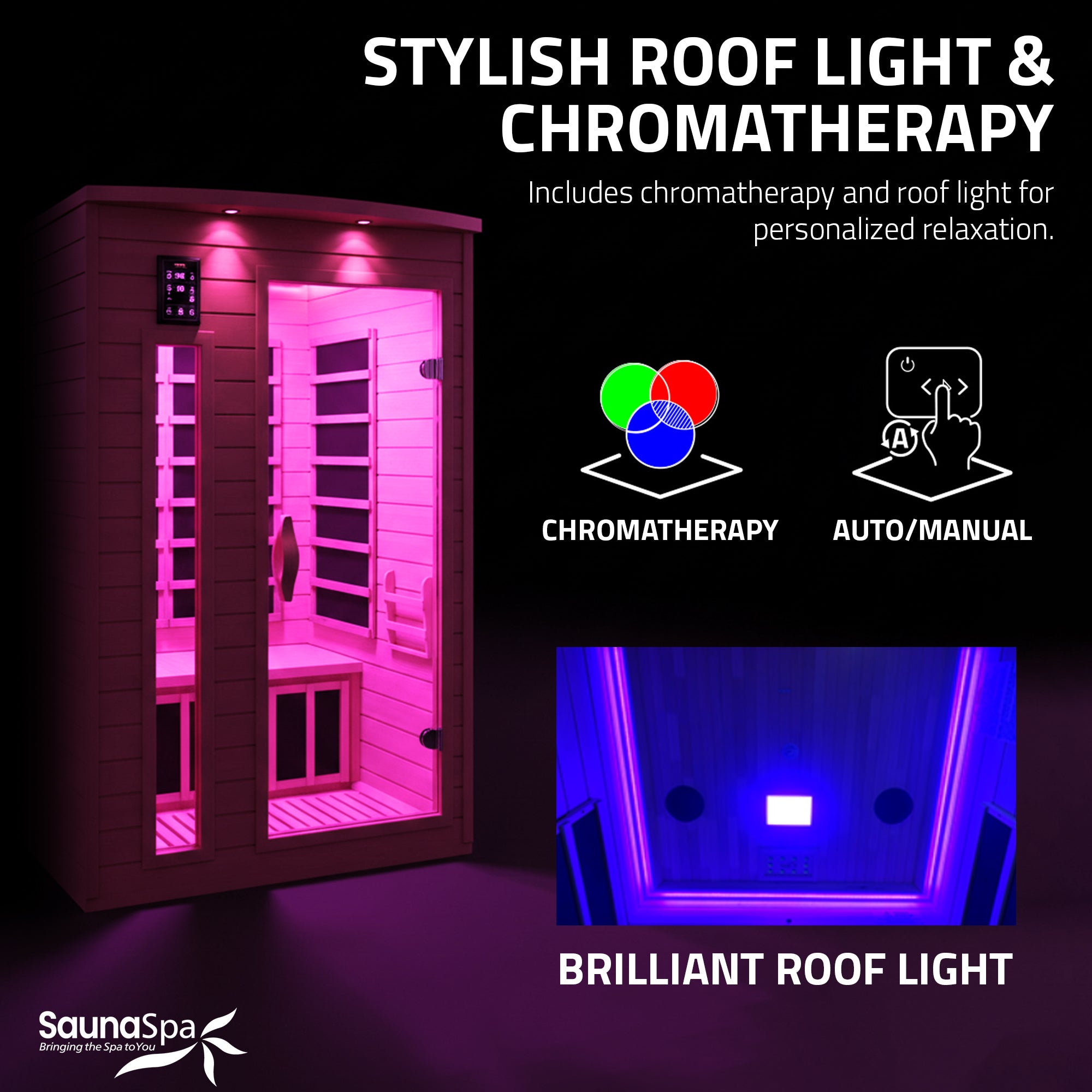 INTERIOR CHROMATHERAPY LIGHTING: Ceiling mounted canopy and perimeter cove style chromatherapy color lighting creates a calming, customizable sauna ambiance to support relaxation and wellness.