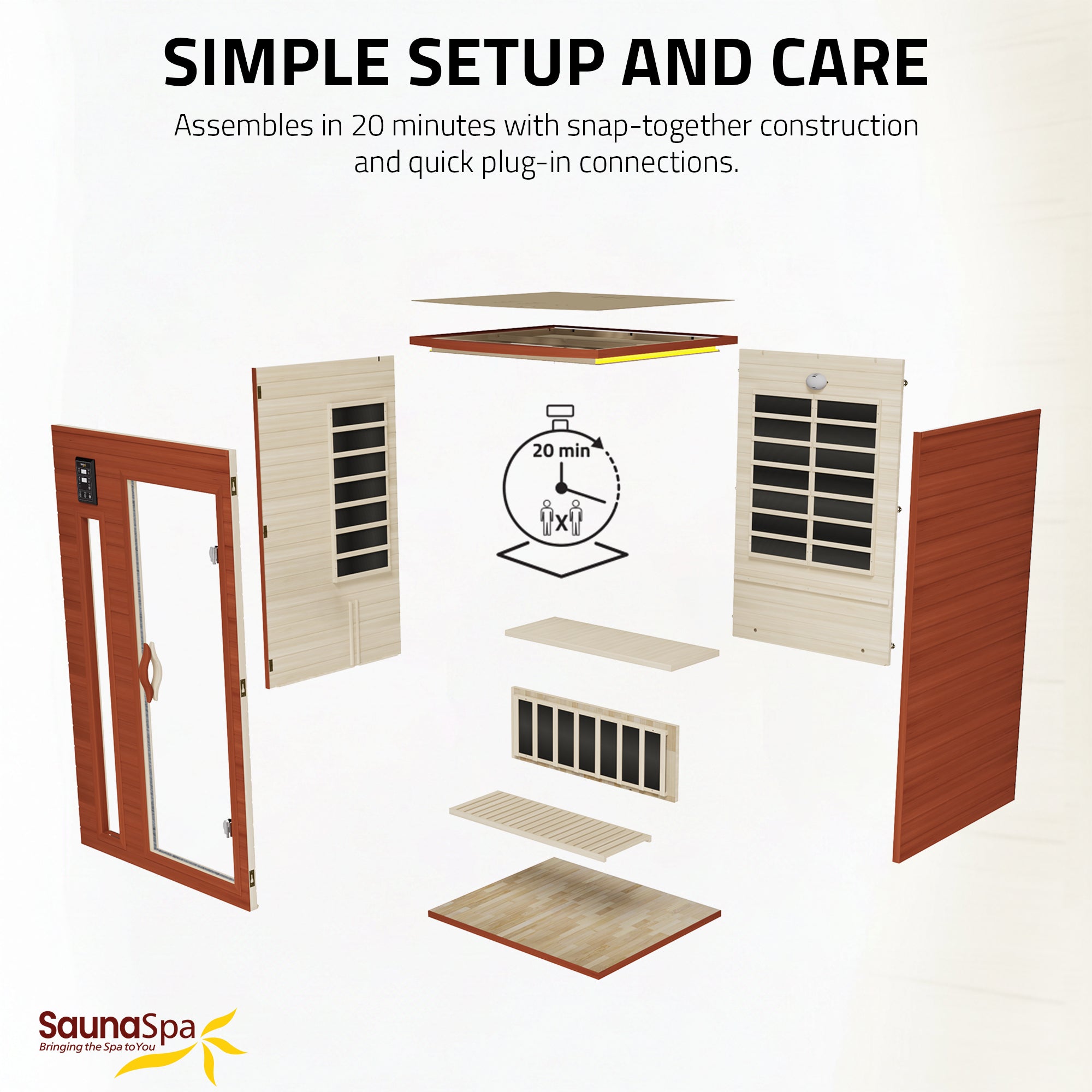 INDOOR 2-PERSON SAUNA: SaunaSpa square design 2-person cabin sauna for indoor and personal relaxation.