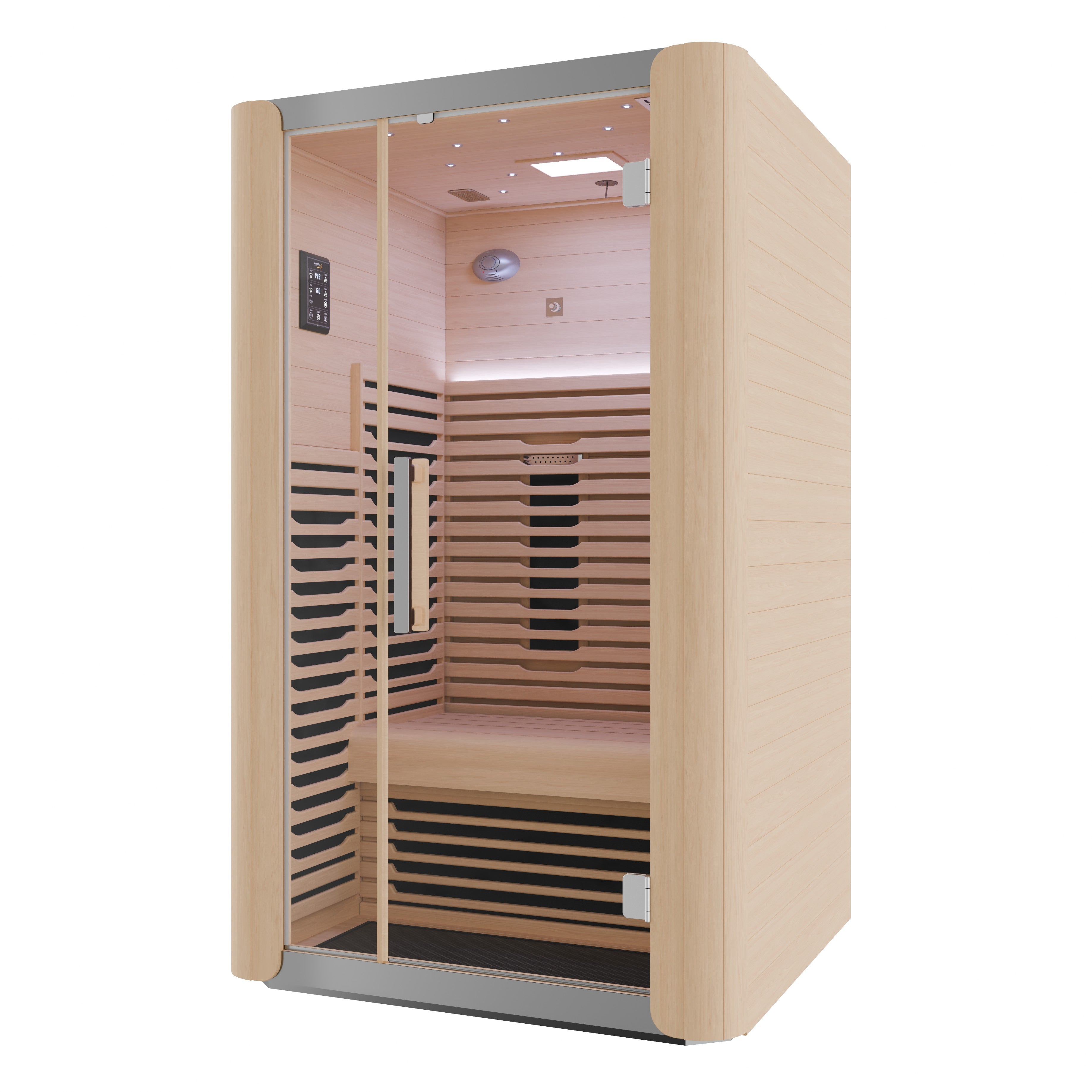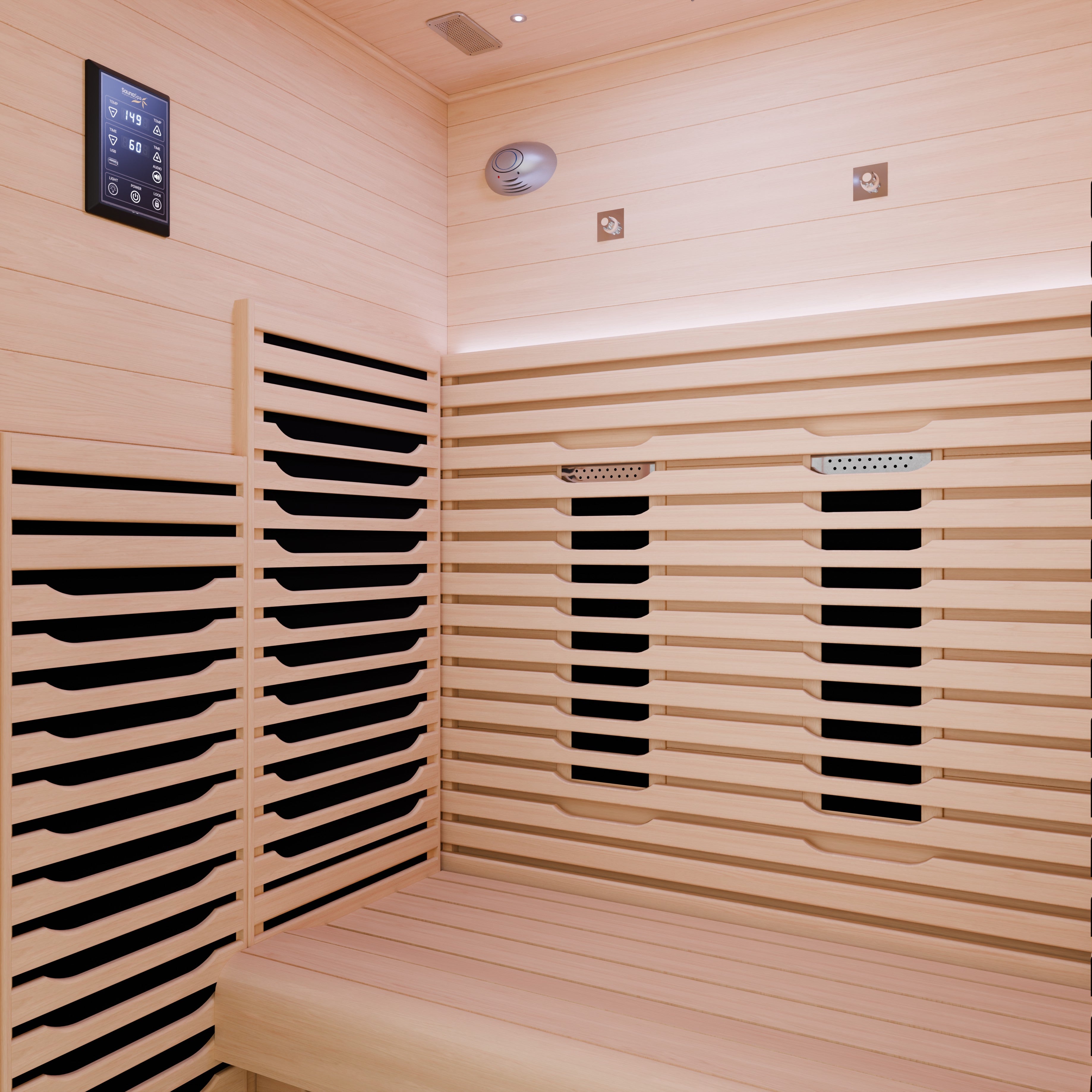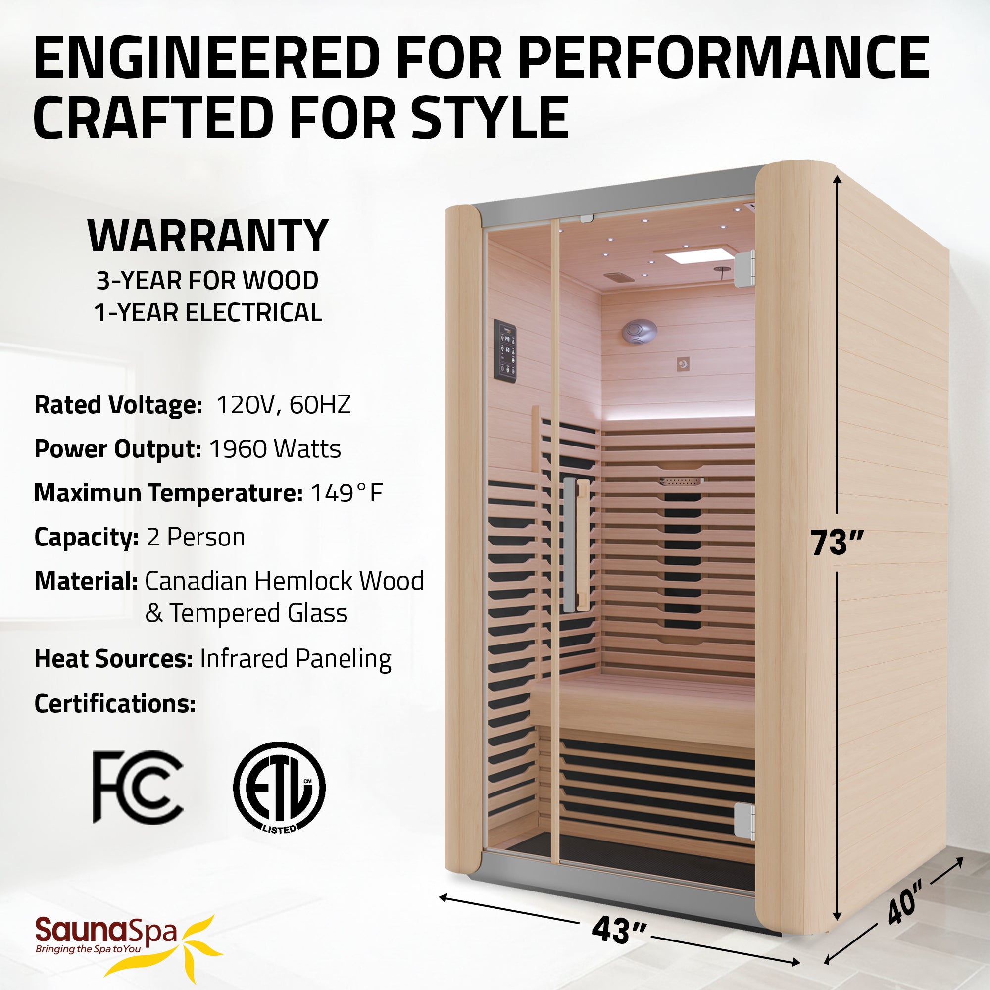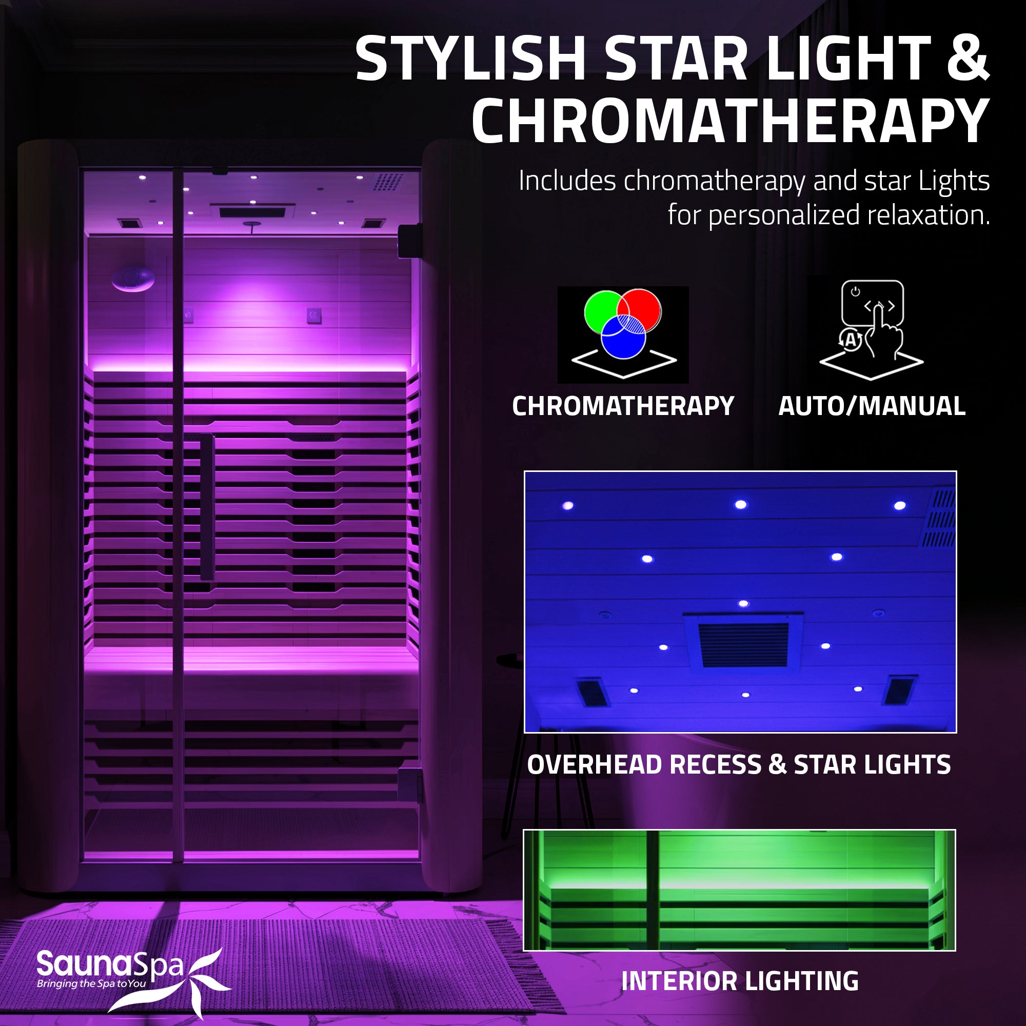 Bring spa-style relaxation into your home with this 2-person infrared sauna. Crafted from premium Canadian hemlock wood, it uses low-EMF infrared heating panels and red light therapy heaters to deliver consistent, gentle warmth that supports everyday wellness. The roof lighting system combines flat color lighting with star-style lights to create a soothing ambiance, while built-in Bluetooth speakers enhance your experience with music. Designed for indoor use, this compact sauna also includes an oxygen ionizer and ventilation system to maintain fresh air and comfort.