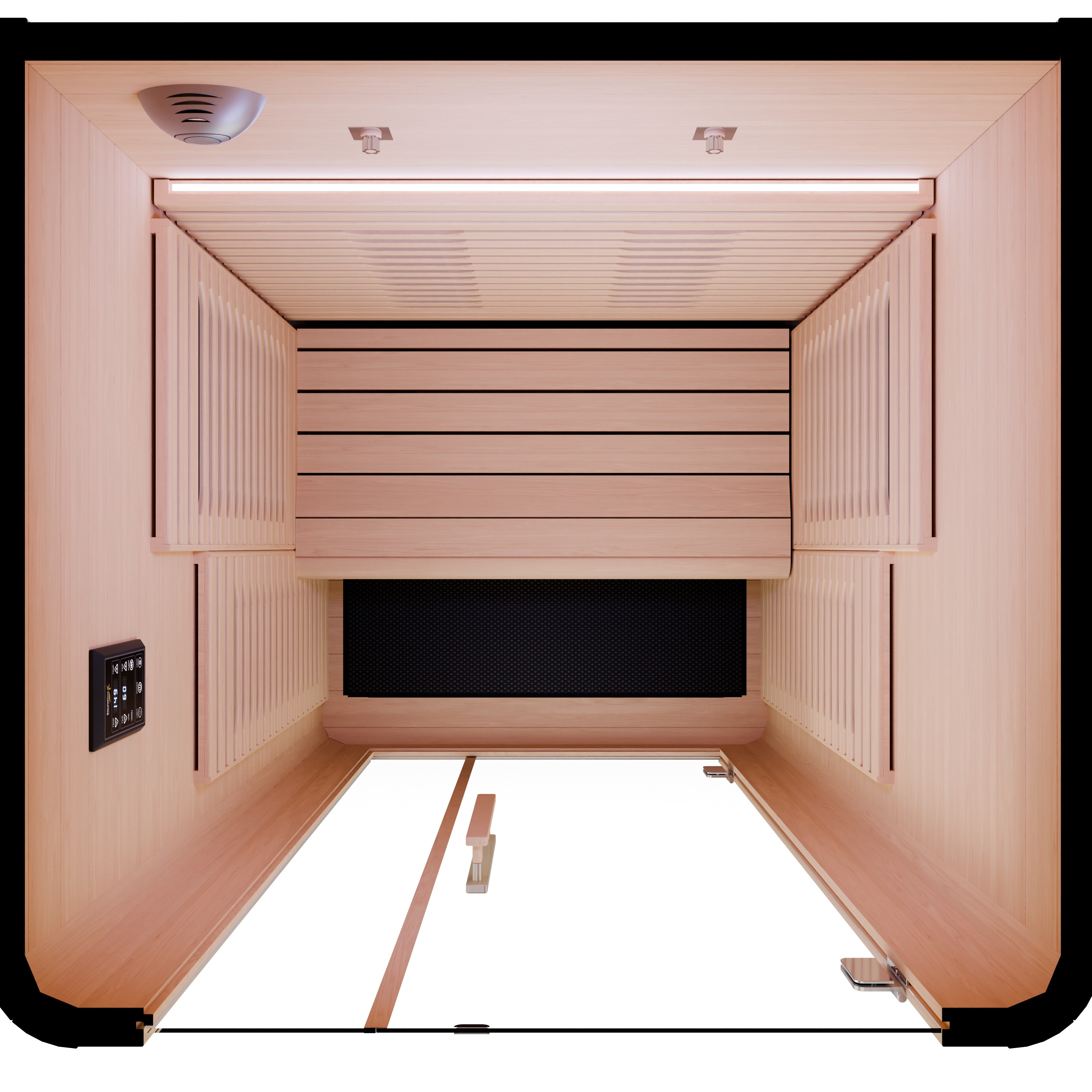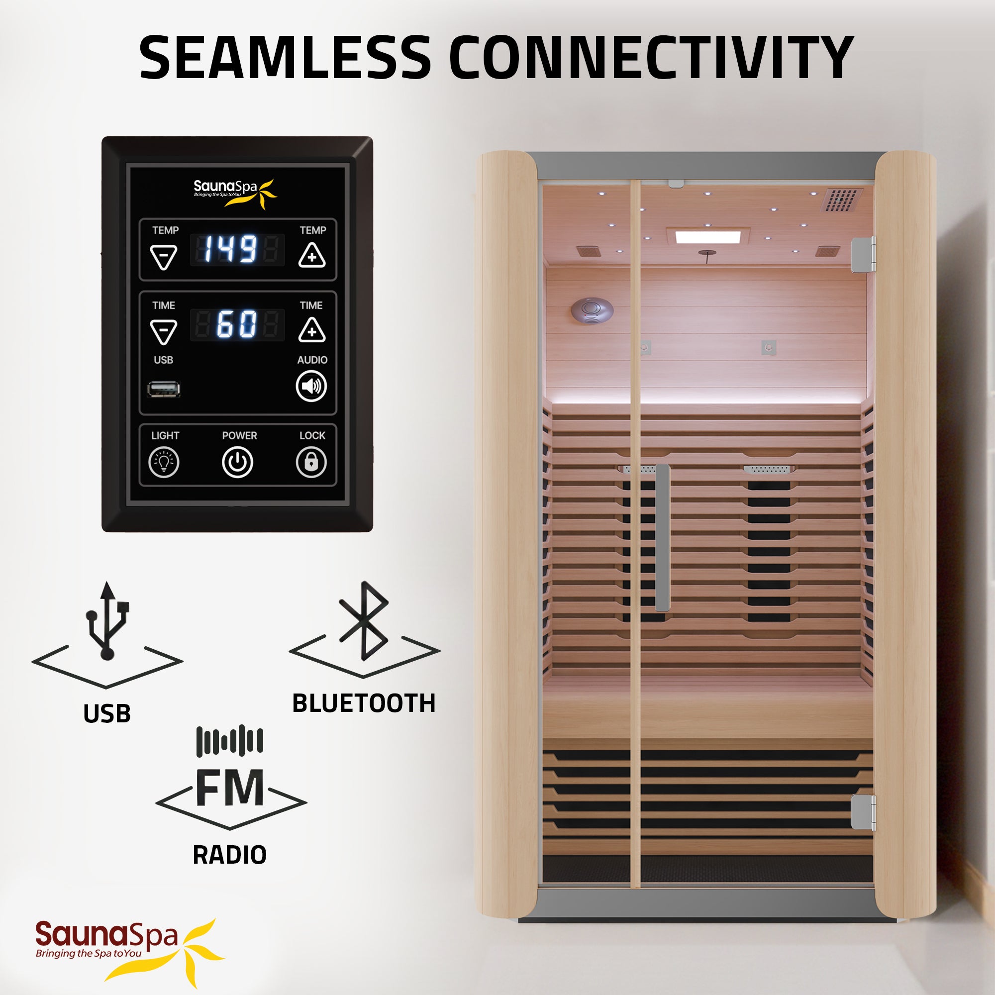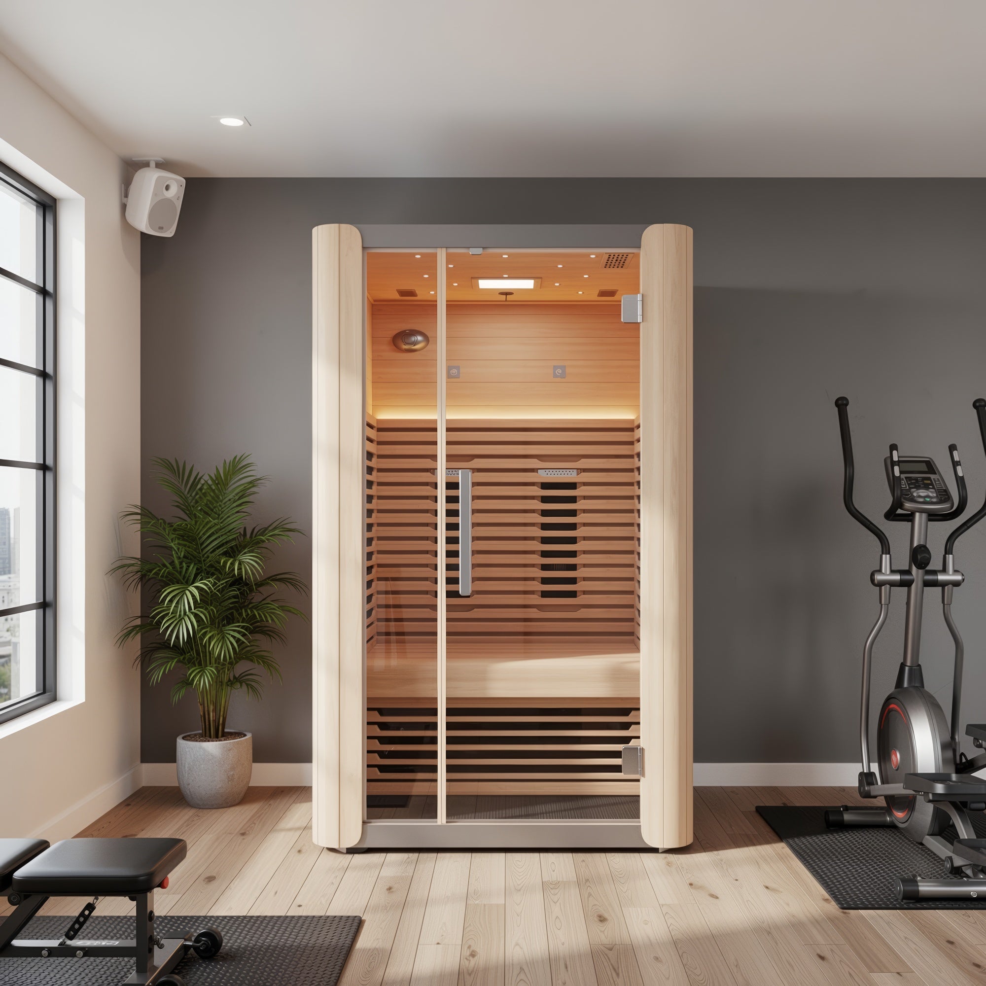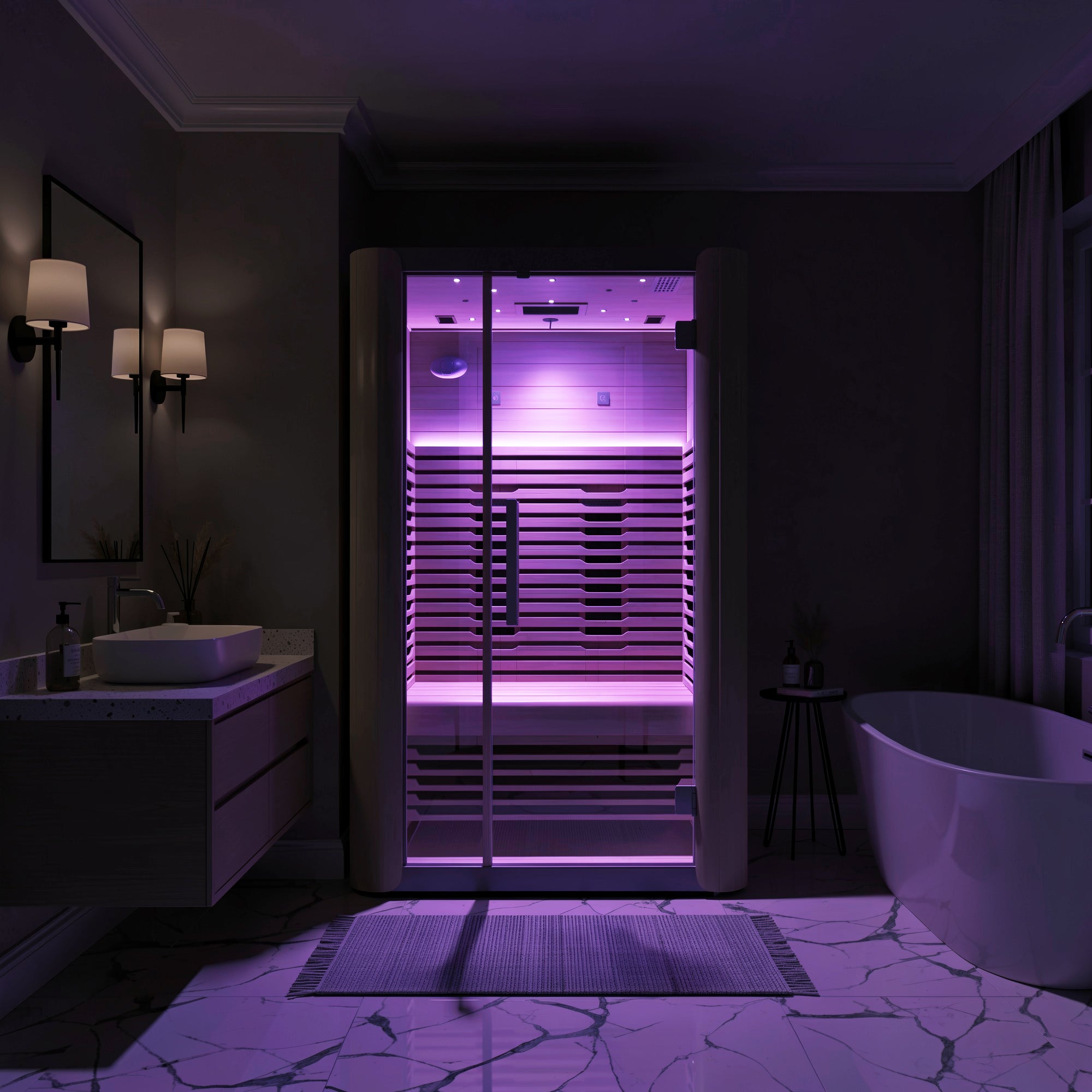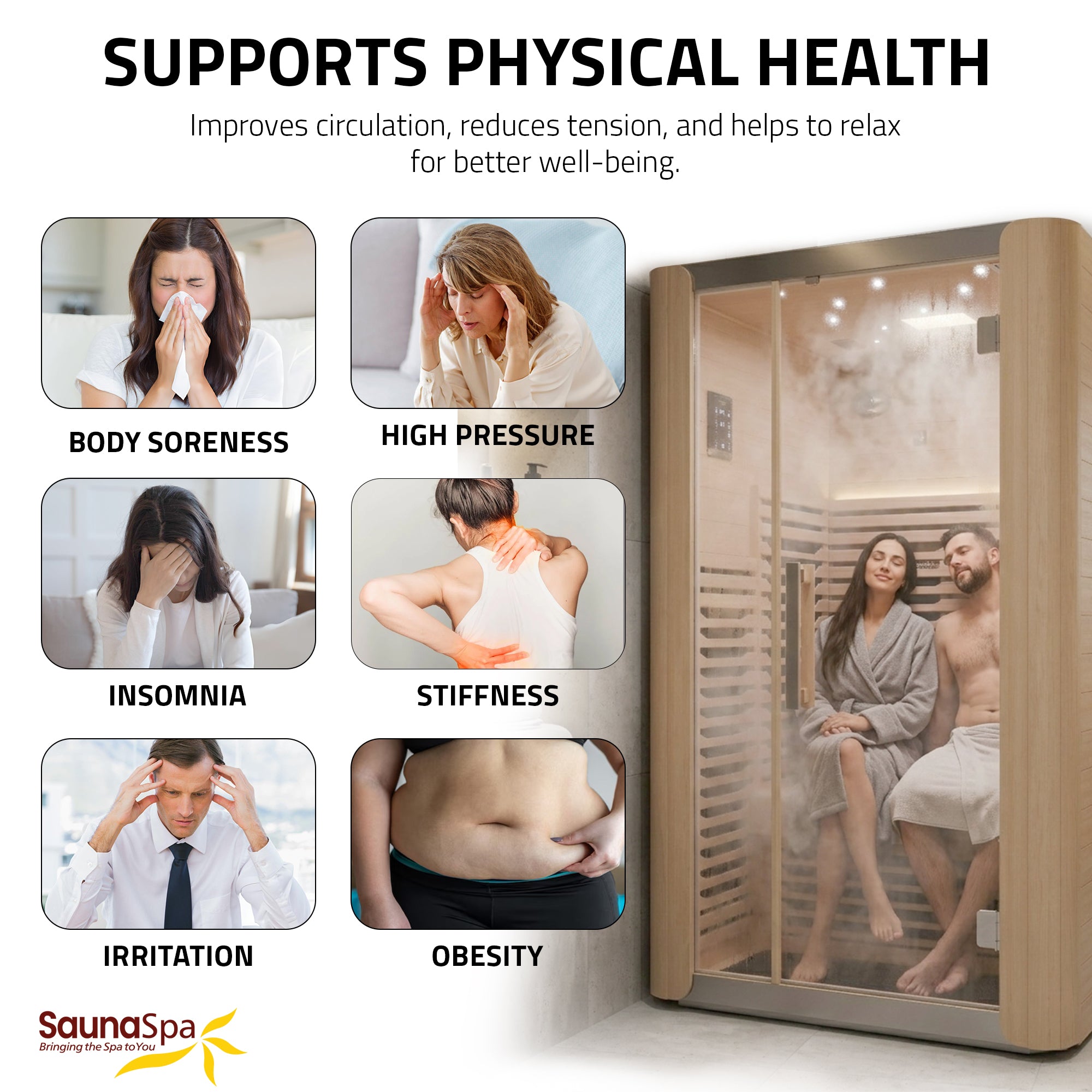 Bring spa-style relaxation into your home with this 2-person infrared sauna. Crafted from premium Canadian hemlock wood, it uses low-EMF infrared heating panels and red light therapy heaters to deliver consistent, gentle warmth that supports everyday wellness. The roof lighting system combines flat color lighting with star-style lights to create a soothing ambiance, while built-in Bluetooth speakers enhance your experience with music. Designed for indoor use, this compact sauna also includes an oxygen ionizer and ventilation system to maintain fresh air and comfort.
