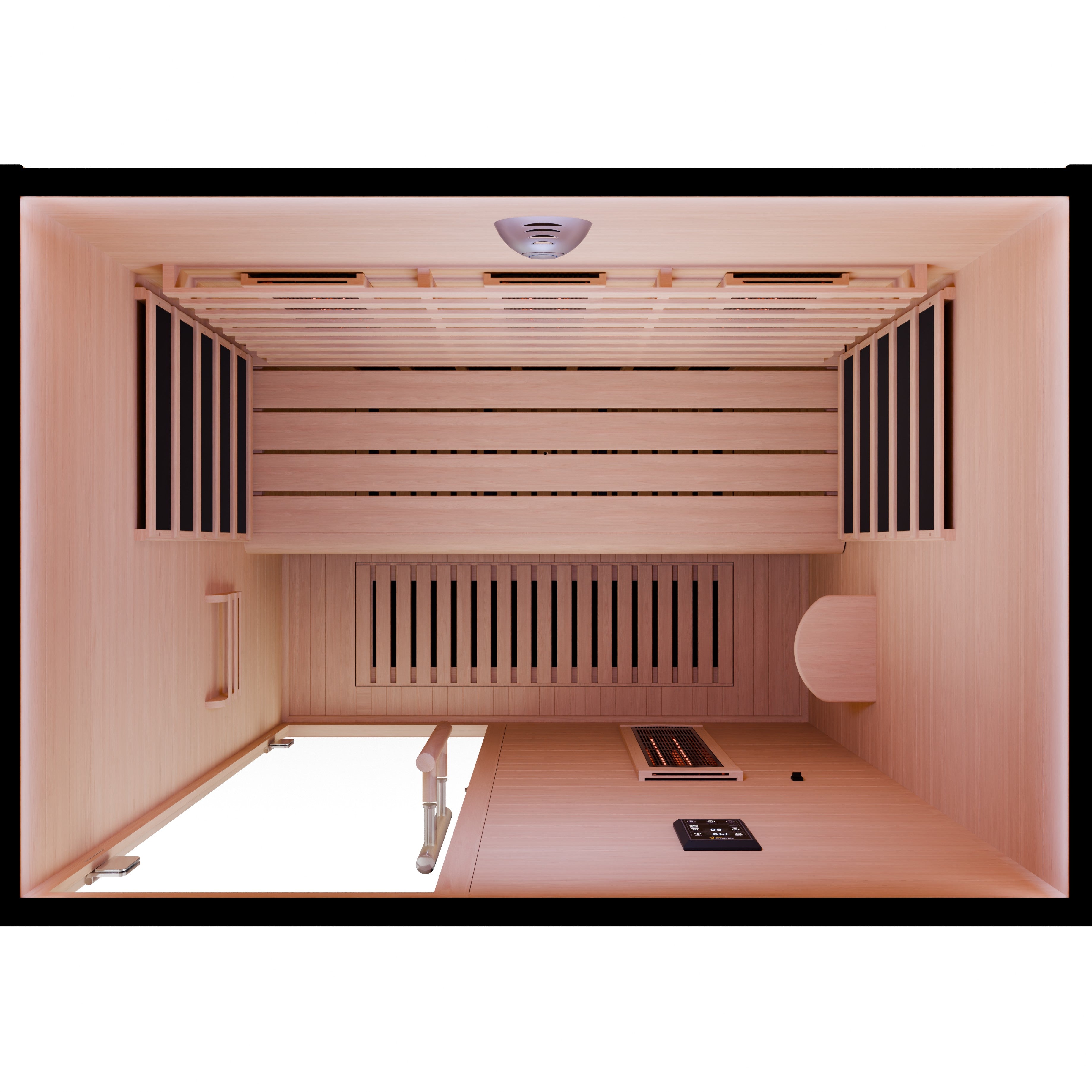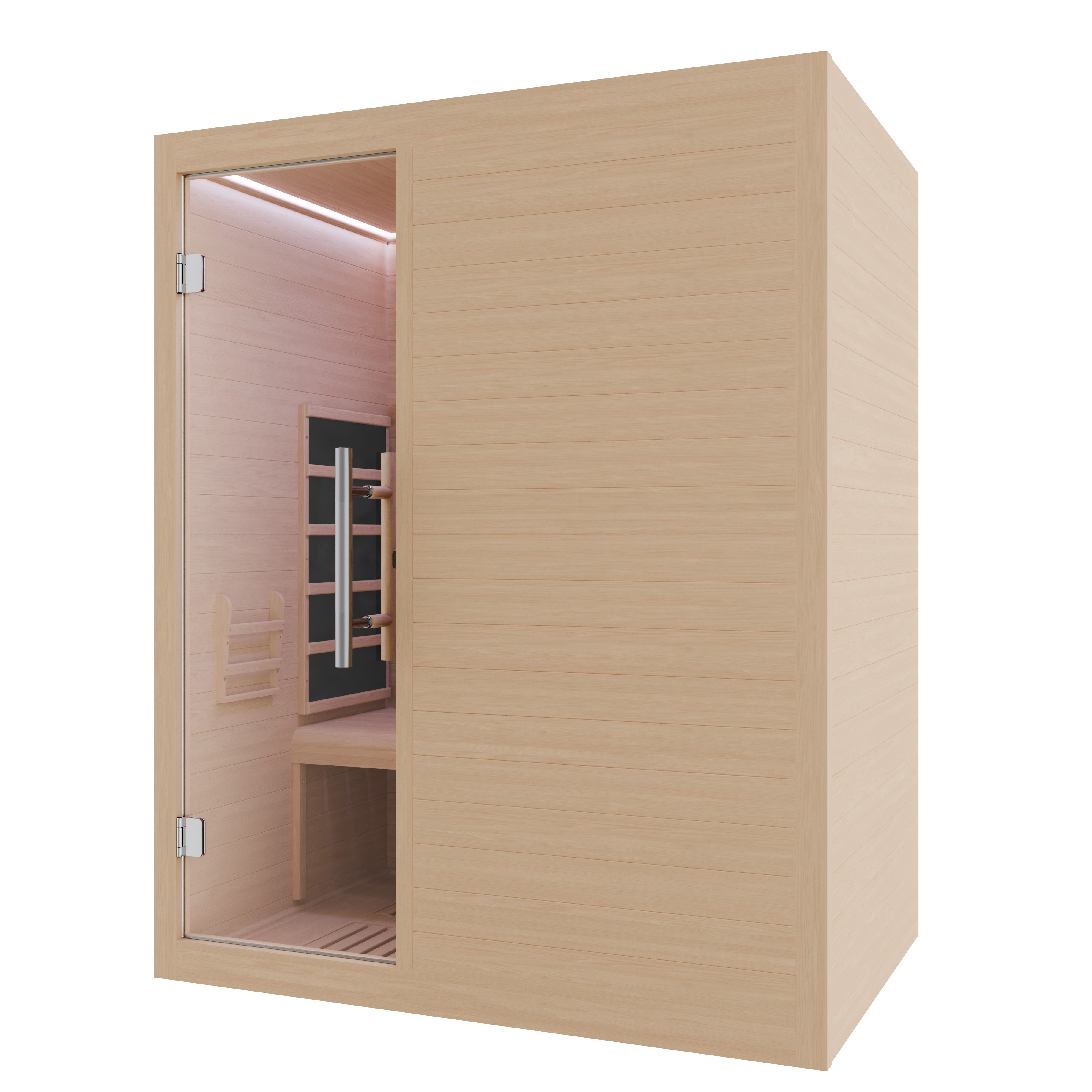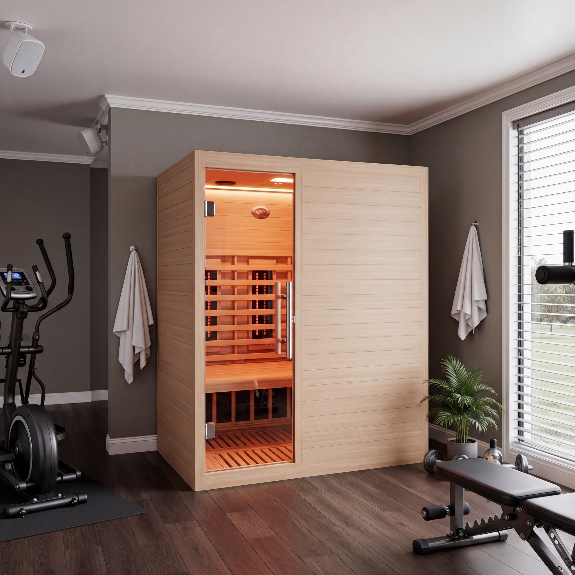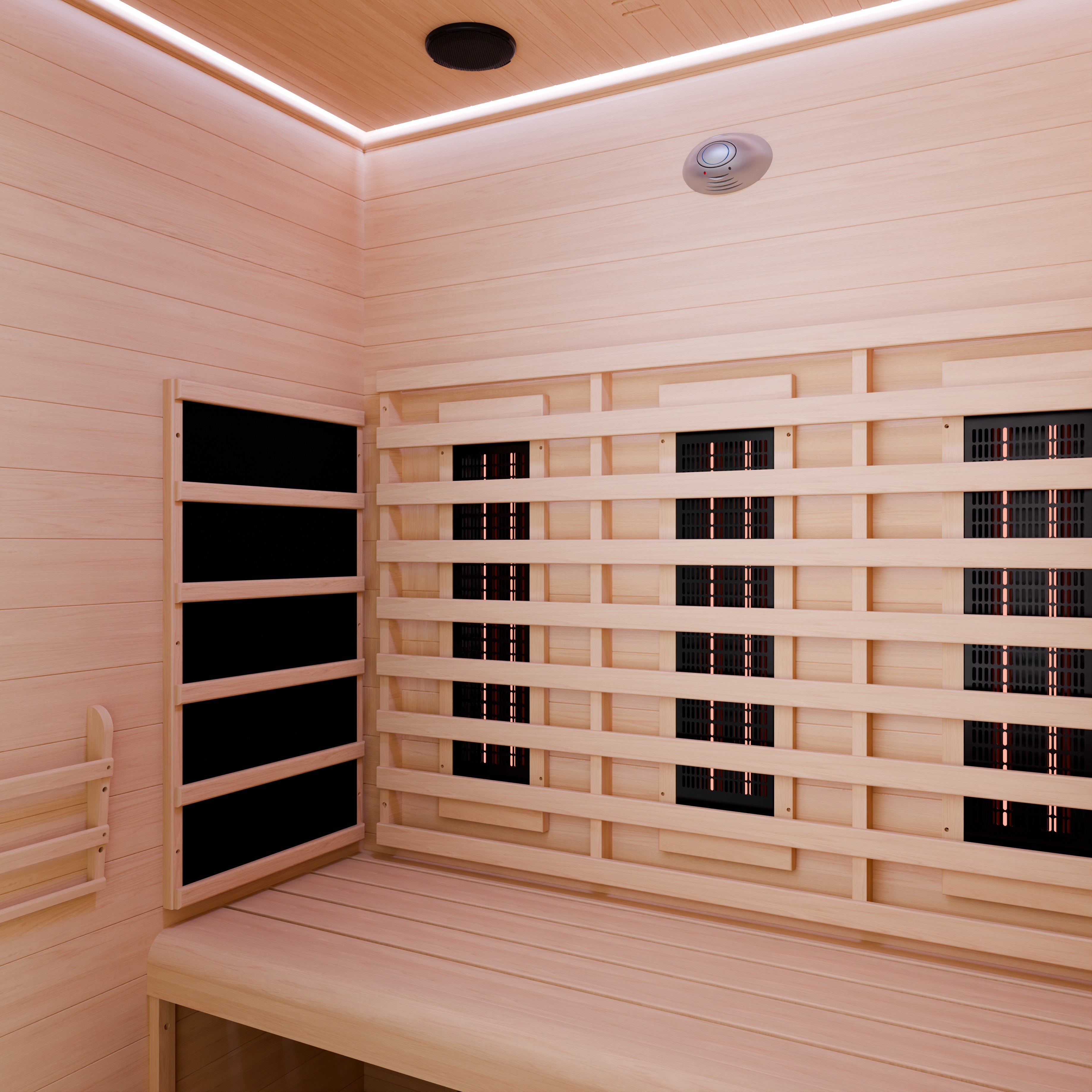 Create a personal wellness retreat at home with this 3-person infrared sauna. Built from durable Canadian hemlock wood, it features low EMF infrared heating panels, red light therapy heaters, and a floor heater for consistent warmth throughout the cabin. Smart WiFi connectivity allows convenient control from your smartphone, while Bluetooth speakers enhance relaxation with music. Designed for indoor use, the sauna also includes chromatherapy lighting, an oxygen ionizer, and ventilation to create a comfortable and refreshing environment for daily recovery and relaxation.