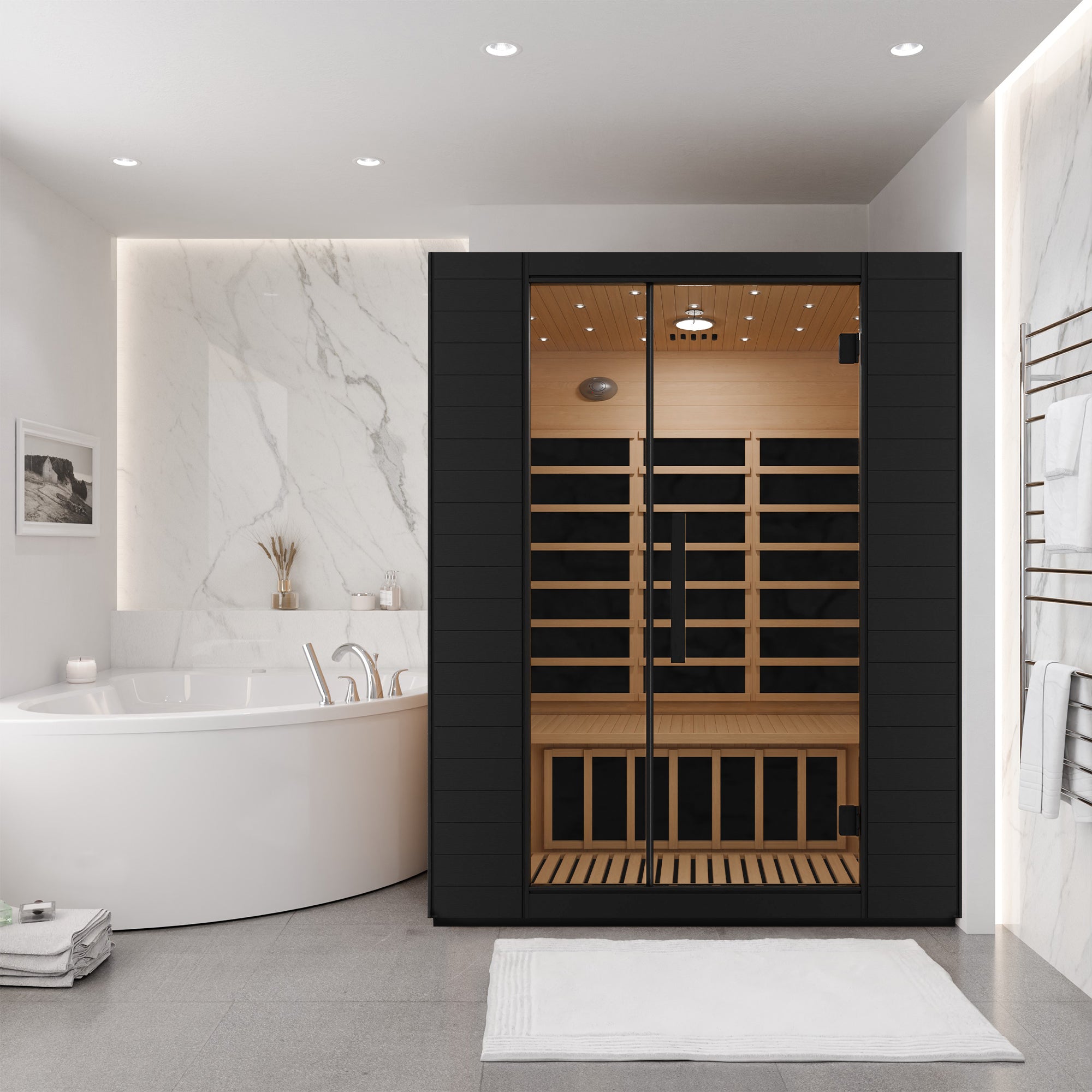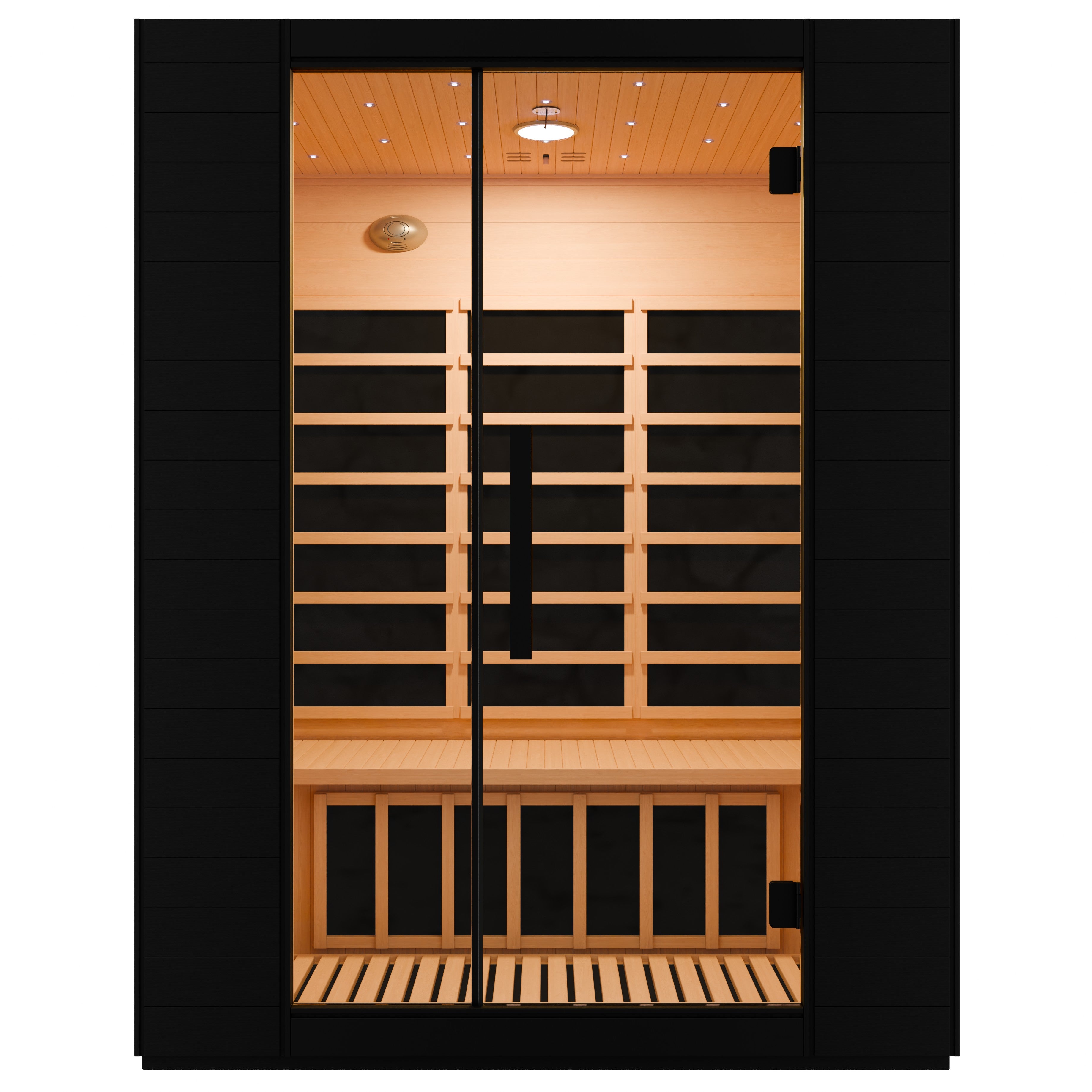 CEILING-MOUNTED CHROMATHERAPY LIGHT PANEL: Integrated chromatherapy canopy lighting delivers customizable illumination to create a calming, spa-like sauna environment.