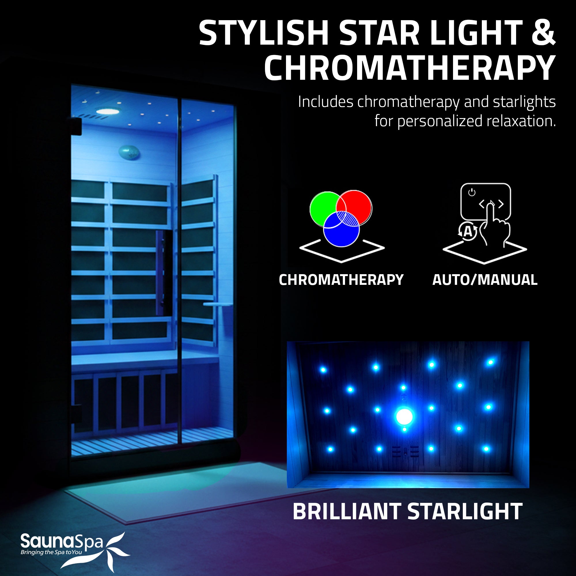 STARLIGHT CEILING ACCENT LIGHTING: Chromatherapy color lights arranged in a starry-night pattern create a tranquil atmosphere, enhancing relaxation with a soft, ambient glow.