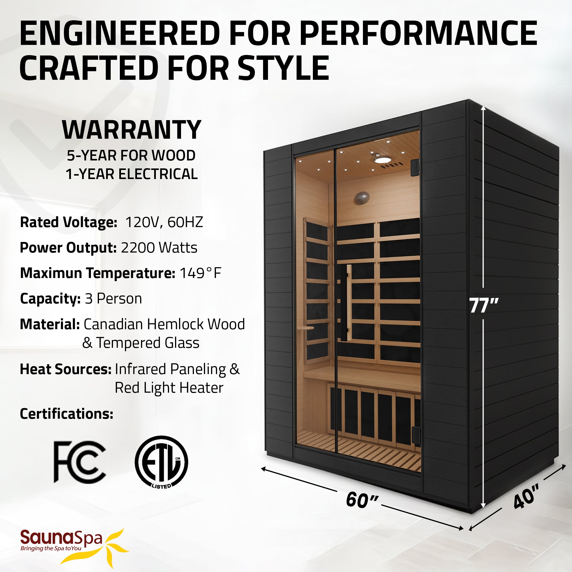 SAFETY CERTIFIED: ETL and FCC certified to meet safety standards for reliable indoor sauna use.