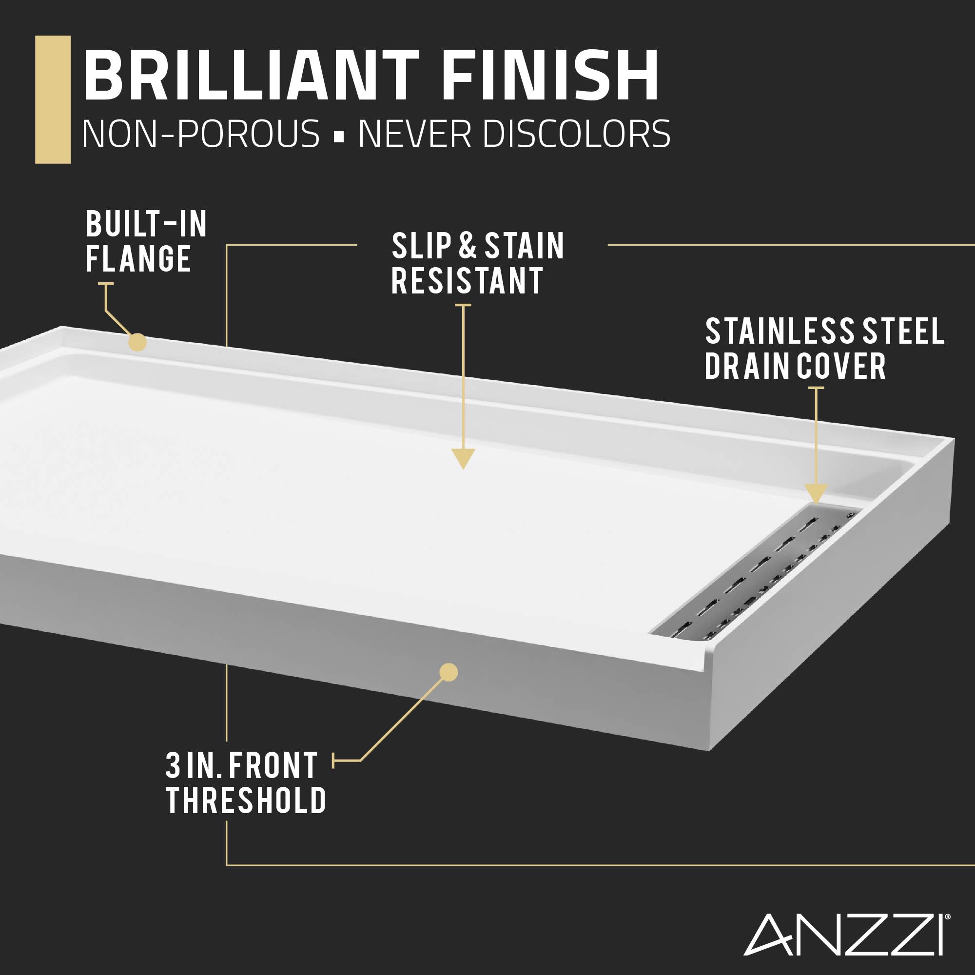 Designing your dream shower? Make sure you start with our smart-looking and stylish ANZZI shower base. We crafted it from premium ANR material, a super-durable blend of resin, fiberglass and stone filler that’s stronger and lighter than both artificial stone and acrylic. The specially textured, slip-resistant floor surface gives you safe and secure footing so you can shower with confidence, while the moisture resistant construction protects against mold, mildew and odor.