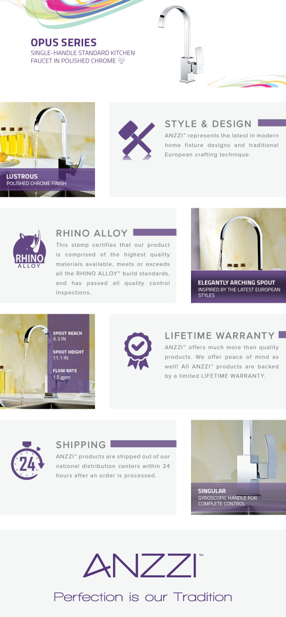 KF-AZ035 ANZZI is committed to introducing the latest in European bath fixture design to the North American home. ANZZI presents the Opus Series Single Handle Kitchen Faucet. Crafted using lead-free RHINO ALLOY certified brass as the interior and our Lustrous Polished Chrome rust resistant finish. This all metal combination of high quality materials ensures you will enjoy a flawlessly performing faucet for many years to come. The deceptively simple single handle design allows for complete and easy control of both water flow and temperature while maintain the fine minimalist aesthetic to match with any modern or contemporary décor style. Additionally, the ANZZI Opus Series features a simple to use and easy to handle Euro-grip sprayer offering the full range of motion needed for even the toughest washes. The ANZZI Opus Series is listed certified under cUPC, NSF, AB1953 for installation within North America.Lustrous Polished Chrome finish RHINO ALLOY certified lead-free solid brass with rust resistant finish Singular (1) gyroscopic handle for complete control Elegantly arching spout inspired by the latest European styles Complete motion 360 degree turning spout Valve included Deck mounted single (1) hole installation Spout Reach: 6.3 in.; Spout Height: 11.1 in. Flow Rate: 1.5 gpm flow rate cUPC, NSF, AB1953 certified and listed for North America Marine grade quality ceramic disk valve include Ships from factory within 24 hours once order is processed Lifetime Warranty To speak to a knowledgeable and dedicated ANZZI specialist simply call 1-844-44-ANZZI or visit us on the web at www.ANZZI.com Specs Sheet Manual / Install Guide Care Guide Warranty
