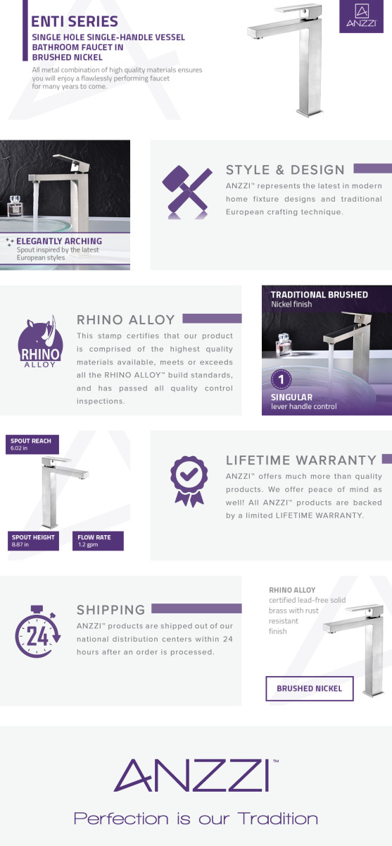 L-AZ096BN ANZZI is committed to introducing the latest in European bath fixture design to the North American home. ANZZI presents the Enti Series Single Handle Vessel Sink Faucet. Crafted using lead-free RHINO ALLOY certified brass as the interior and our Traditional Brushed Nickel rust resistant finish. This all metal combination of high quality materials ensures you will enjoy a flawlessly performing faucet for many years to come. The deceptively simple single handle design allows for complete and easy control of both water flow and temperature while maintain the fine minimalist aesthetic to match with any modern or contemporary décor style. The ANZZI Enti Series is listed certified under cUPC, NSF for installation within North America.Traditional Brushed Nickel finish RHINO ALLOY certified lead-free solid brass with rust resistant finish Singular (1) lever handle control Elegantly arching spout inspired by the latest European styles Deck mounted single (1) hole installation Spout Reach: 6.02 in.; Spout Height: 8.87 in. Flow rate: 1.2 gpm cUPC, NSF certified and listed for North America Limited Lifetime Warranty To speak to a knowledgeable and dedicated ANZZI specialist simply call 1-844-44-ANZZI or visit us on the web at www.ANZZI.com Specs Sheet Manual / Install Guide Care Guide Warranty