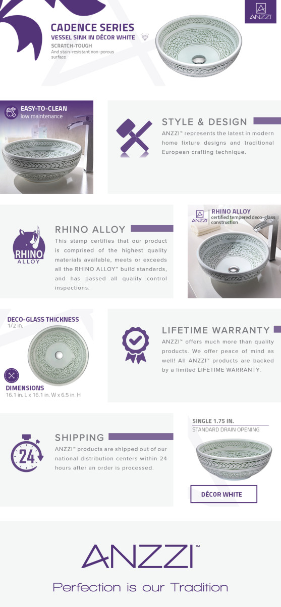 The ANZZI Cadence Series sink is a traditionally crafted round vessel sink adorned in a Décor White finish. Each ANZZI vessel sink is formed using RHINO ALLOY certified high tempered Deco-Glass material. The result is an elegantly shaped and captivating vessel centerpiece for any bathroom counter.