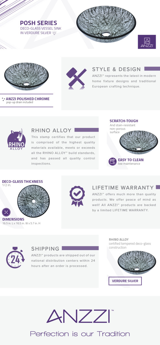 LS-AZ297 The ANZZI Posh Series sink is a traditionally crafted round vessel sink adorned in a Verdure Silver finish. Each ANZZI vessel sink is formed using RHINO ALLOY certified high tempered Deco-Glass material. The result is an elegantly shaped and captivating vessel centerpiece for any bathroom counter.RHINO ALLOY certified tempered deco-glass construction in a stunning Verdure Silver finish Scratch-tough and stain-resistant non-porous surface Easy-to-clean low maintenance Top mount installation Dimensions: 16.5 in. L x 16.5 in. W x 5.7 in. H Deco-glass thickness: 1/2 in. Single 1.75 in. standard drain opening ANZZI polished chrome pop-up drain included Ships from factory within 24 hours once order is processed Lifetime Warranty To speak to a knowledgeable and dedicated ANZZI specialist simply call 1-844-44-ANZZI or visit us on the web at www.ANZZI.com Specs Sheet Manual / Install Guide Care Guide Warranty