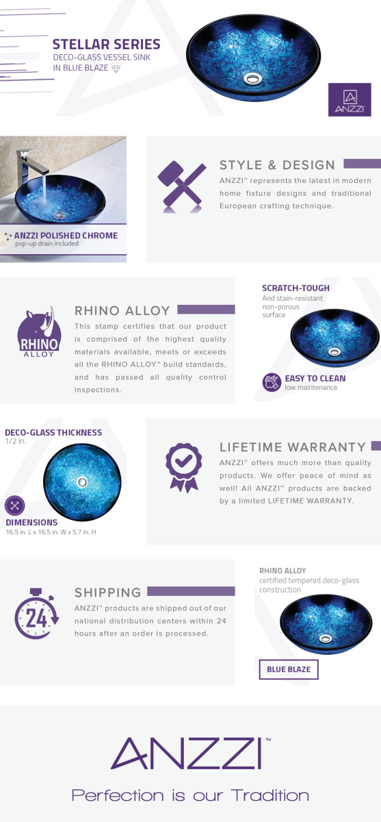 S263 The ANZZI Tara Series sink is a traditionally crafted round vessel sink adorned in a Blue Blaze finish. Each ANZZI vessel sink is formed using RHINO ALLOY certified high tempered Deco-Glass material. The result is an elegantly shaped and captivating vessel centerpiece for any bathroom counter.RHINO ALLOY certified tempered deco-glass construction Scratch-tough and stain-resistant non-porous surface Easy-to-clean low maintenance Top mount installation Dimensions: 16.5 in. L x 16.5 in. W x 5.7 in. H Deco-glass thickness: 1/2 in. Single 1.75 in. standard drain opening ANZZI Polished Chrome pop-up drain included Ships from factory within 24 hours once order is processed Limited Lifetime Warranty To speak to a knowledgeable and dedicated ANZZI specialist simply call 1-844-44-ANZZI or visit us on the web at www.ANZZI.com Specs Sheet Manual / Install Guide Care Guide Warranty