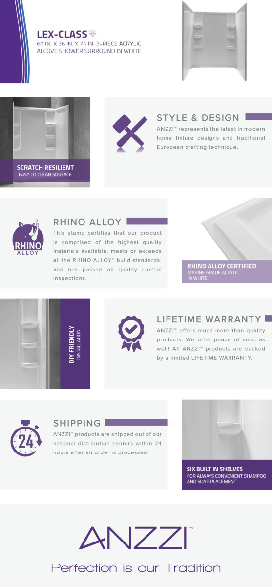 Quickly and near effortlessly transform your shower from the normal everyday design to the latest is contemporary shower décor and style. The ANZZI shower wall system is crafted using RHINO ALLOY certified parts and material including scratch resilient marine grade acrylic. These easy-DIY shower walls also features six deep set easy access shampoo shelves providing ample storage and convenience. Offering high end quality, low maintenance and trusted reliability the ANZZI shower wall system is the optimal choice for modern shower upgrades.