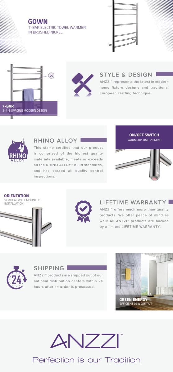Indulge in a little luxury every day with our ANZZI Gown 7-bar stainless steel wall mounted electric towel warmer rack in brushed nic......